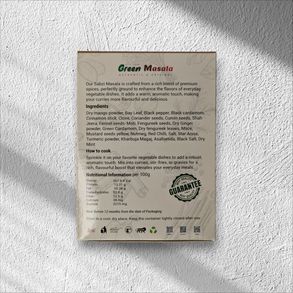 Our Sabzi Masala is crafted from a rich blend of premium spices, perfectly ground to enhance the flavors of everyday vegetable dishes. It adds a warm, aromatic touch, making your curries more flavourful and delicious.